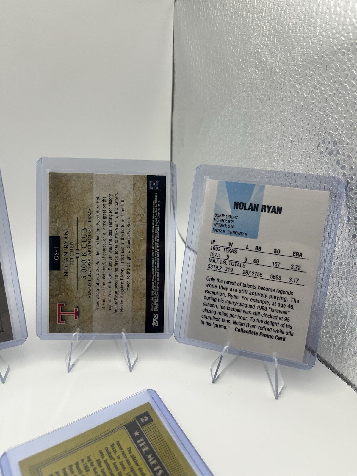 The Nolan Ryan Baseball Card Lot includes 24 sports trading cards featuring the legendary baseball player. These cards are a must-have for any baseball fan or collector looking to add a piece of history to their collection. Each card likely showcases Ryan's skills and career highlights, making it a valuable and sought-after item in the sports memorabilia market. Whether displayed or stored, these trading cards are sure to be a cherished addition to any baseball card collection.