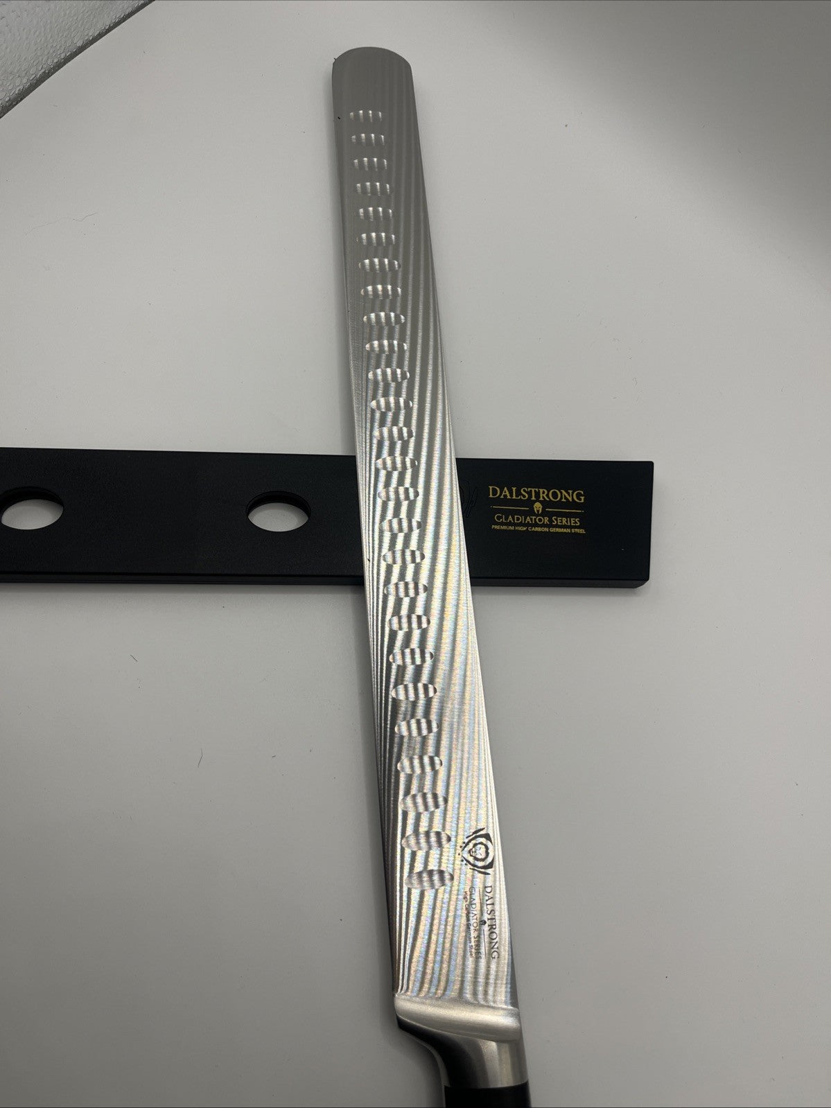 The Razor Sharp 12-Inch Granton Edge Meat Carving Knife is a luxurious and high-quality kitchen tool perfect for slicing and carving meats with precision. Made with high carbon steel and a G10 handle, this knife boasts a 12-inch blade with a hollow edge, ensuring easy and effortless cutting. NSF certified and featuring a razor-sharp edge, this slicing knife is not only functional but also a stylish addition to any kitchen. It is a perfect gift for meat lovers and chefs alike, offering both practicality and elegance in one versatile piece.